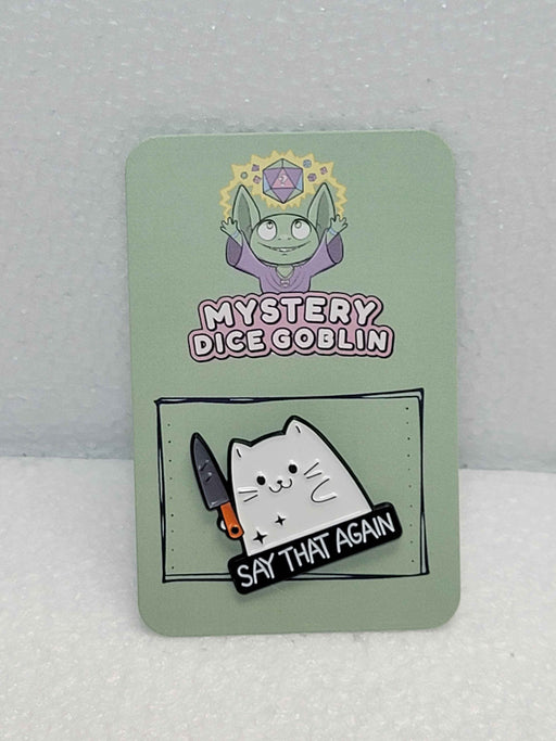 Mystery Dice GoblinBring some sharp humor to your next tabletop session with the "Say That Again" Cat Pin from Mystery Dice Goblin. This enamel pin perfectly captures...
